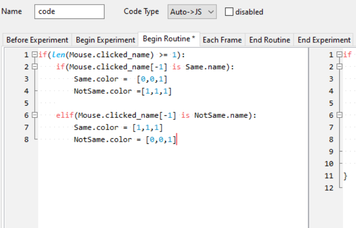 Each button is set for every repeat, and the mouse has clickable stimuli for the buttons (see screenshot). I also wanted to add a feedback to the clicking, so participants see which option they clicked.