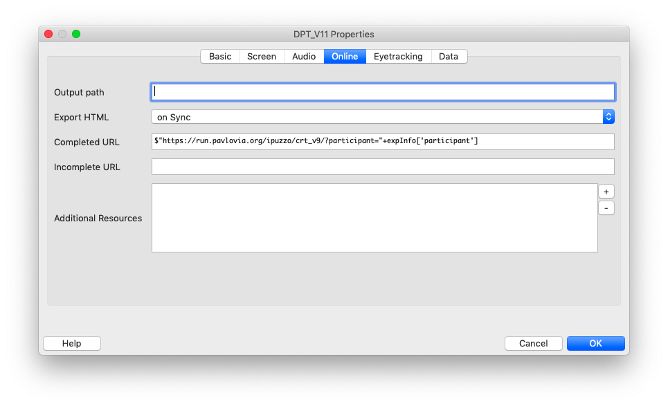 Description of the problem: I am trying to link several Pavlovia experiments together. I have successfully done this for the first experiments, where experiment 1 successfully redirects to experiment 2 (crt_v6), but this 2nd experiment refuses to successfully redirect to experiment 3 (eabv8). The “completed url” is correct in experiment settings in Psychopy, and it displays correctly in the javascript file when uploaded to Pavlovia, but when actually running the CRT_V6 experiment, at the end it tries to go to [url]/eab/v8 rather than [url]/eabv8 i.e., it seems to be inserting another forward slash where there shouldn’t be one (sorry I’m a new user so I can’t put more than 2 links in a post). The error page I get is “404 Not Found”. In the experiment settings on PsychoPy I also tell it to grab the participant number from the previous experiment by adding ?participant="expInfo[‘participant’] to the end of the url in the completed url box (as per wake carter’s crib sheet), which also worked fine for experiment 1 → experiment 2. I am using Psychopy version 2021.2.3