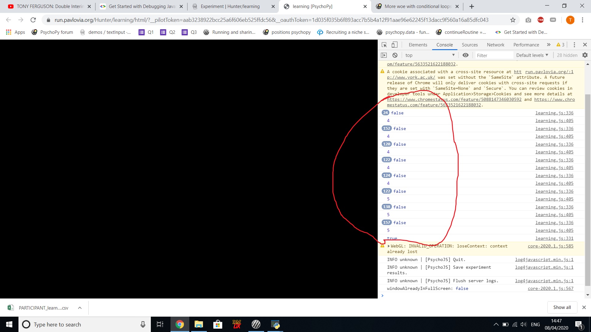 (2) skipThisTrial=True never works (this fits with what the experience I have when I run it, described above) and this lets the dictionary values keep climbing when the experiment should finish when they all reach the value of 2.