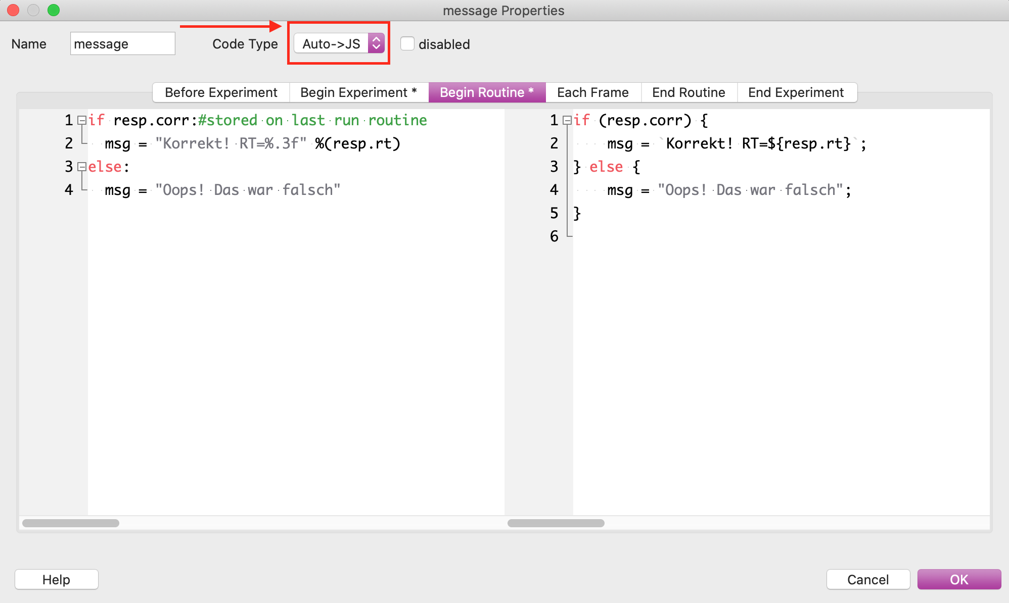 On each of your code components, could you please change the drop down from ‘Py’ to ‘Auto JS’ - meaning that the Python code typed in the left hand side is automatically converted to javascript on the right hand side, as in the screenshot below: