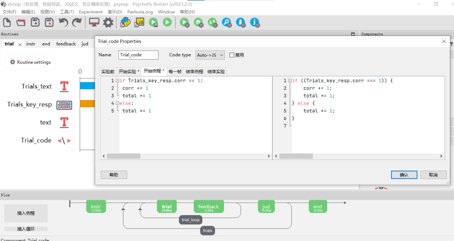 The second feedback was whether the subjects achieved 80% accuracy in the stroop exercise routine. The subjects can enter the formal experiment only when they reach it, otherwise they can re-enter the cycle to practice until they pass.This feedback I named “jud”, as you can see in the figure.